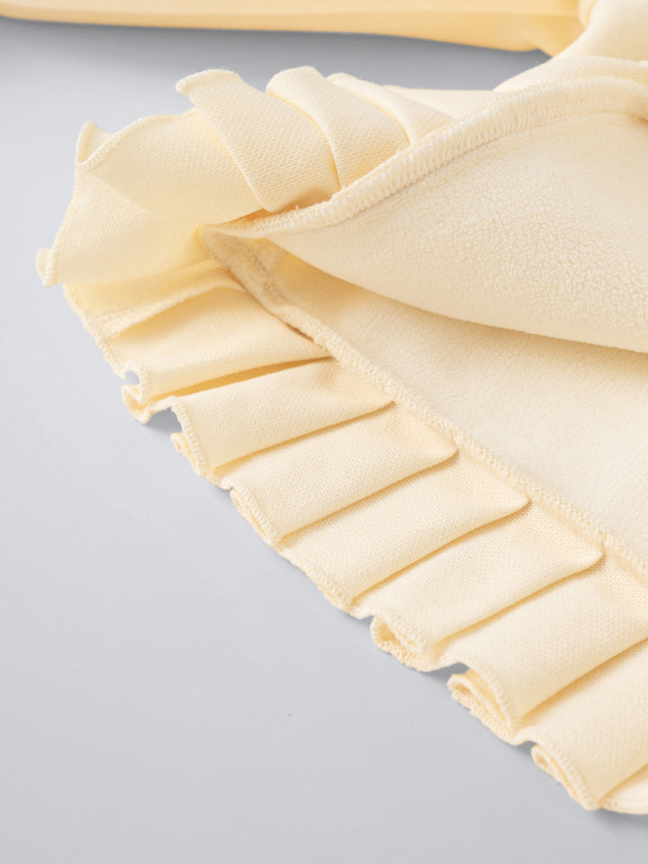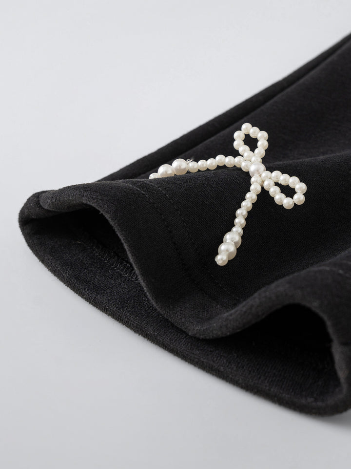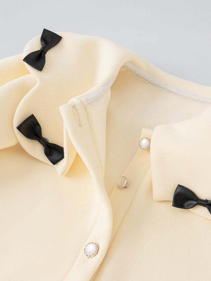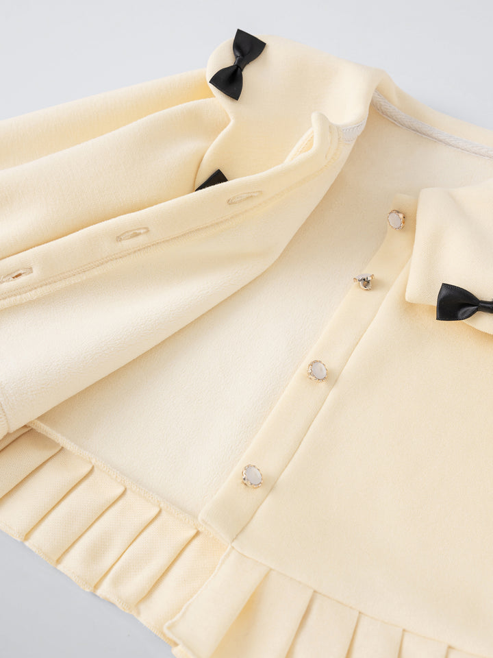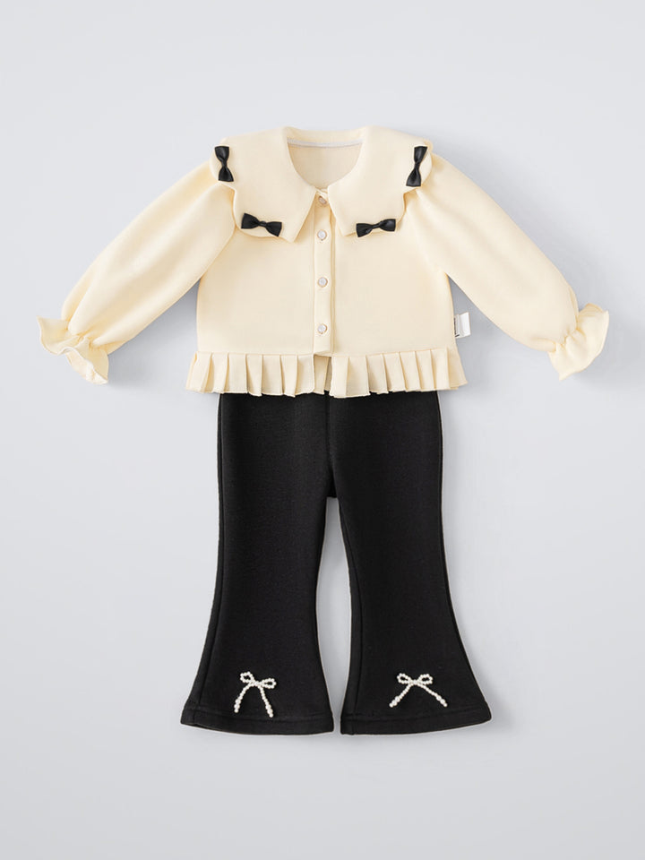 طقم بناتي أنيق مكوّن من بلوزة كريمية ناعمة بلمسات كشكش ناعمة وزرار بتفاصيل فخمة، مزينة ببيونات سوداء صغيرة على الياقة والأكتاف. يأتي معها بنطلون أسود واسع من الأسفل، مزين بتطريز على شكل بيونة من اللؤلؤ. مثالي للمناسبات الراقية أو التجمعات العائلية في المواسم الباردة.